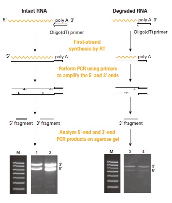 RNA/cDNA Quality Assay´Â ½ÇÇè Àü¿¡ ¿ÂÀüÇÏÁö ¸øÇÑ RNA¸¦ ½ÇÇè¿¡ »ç¿ëÇÏ´Â °ÍÀ» ¹æÁöÇÔÀ¸·Î½á ½Ã°£°ú ºñ¿ëÀÇ ³¶ºñ¸¦ ¹æÁöÇÒ ¼ö ÀÖ´Ù. ÀÌ ºÐ¼®¹ýÀº ¾ö¼±µÈ housekeeping geneÀÇ mRNA (~3 kb)¿¡ ´ëÇÏ¿© 5¡¢-¸»´Ü°ú 3¡¢-¸»´ÜÀ» ÁõÆøÇÒ ¼ö ÀÖ´Â 2 ½ÖÀÇ primer¸¦ ÀÌ¿ëÇÏ¿© multiplex RTPCRÀ» ¼öÇàÇÑ´Ù. ´ëºÎºÐÀÇ °æ¿ì RNA ºÐÇØ´Â RNAÀÇ 5¡¢-¸»´Ü ¿µ¿ª¿¡¼ ½ÃÀ۵ǹǷΠ3¡¢-¸»´Ü ÁõÆø ´ÜÆíÀÇ ºñÀ²¿¡ ´ëÇÑ 5¡¢-¸»´Ü ´ÜÆíÀÇ ºñÀ²ÀÌ RNA ¼Õ»óµµ¸¦ ³ªÅ¸³»´Â Á÷Á¢ÀûÀÎ ÁöÇ¥°¡ µÈ´Ù (Figure 1).