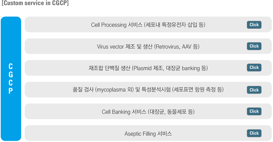 ´ë±Ô¸ð GMP/GCTP Áö¿ø½Ã¼³ÀÎ CGCP(Center for Gene and Cell Processing)´Â À¯ÀüÀÚ ÀÇ·á(À¯ÀüÀÚ Ä¡·á, ¼¼Æ÷ ÀÇ·á µî)¸¦ À§ÇÑ °¢Á¾ Cell Banking, À¯ÀüÀÚ ÀÇ·á¿ë vector Á¦ÀÛ, ¼¼Æ÷ °¡°ø ¹× ÀçÁ¶ÇÕ ´Ü¹éÁú µîÀÇ ½ÃÇè¿ë ½Å¾àÀ» GMP ±âÁØ¿¡ µû¶ó Á¦Á¶ ÇÒ ¼ö ÀÖ½À´Ï´Ù. ±âŸ ǰÁú ½ÃÇè ¹× Æ¯¼º ºÐ¼®, º¸°ü ¼ºñ½ºµµ ½ÃÇàÇϰí ÀÖÀ¸¸ç, À¯ÀüÀÚ Ä¡·á ÇÁ·ÎÁ§Æ®ÀÇ ±â¹Ý ±â¼ú °³¹ß°ú ¾Æ¿ï·¯ ÀÓ»ó °³¹ßÀÇ º£½ºÆ® ÆÄÆ®³Ê·Î¼ °í°´À» Áö¿øÇÕ´Ï´Ù.
