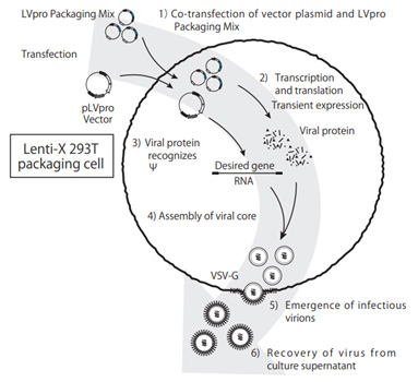Ÿ°Ù À¯ÀüÀÚ¸¦ Æ÷ÇÔÇÏ´Â pLVpro lentiviral vector plasmid¿Í LVpro Packaging Mix¸¦ co-transfectionÇϸé (Step 1), ÀçÁ¶ÇÕ lentiviral genomic RNA Àü»çü¿Í ¹ÙÀÌ·¯½º ÆÐŰ¡ ´Ü¹éÁúÀÌ »ý¼ºµÈ´Ù (Step 2). ÀçÁ¶ÇÕ viral RNA genomicÀÇ ÆÐŰ¡ ¼¿ (¥×)ÀÌ ÆÐŰ¡ ´Ü¹éÁú¿¡ ÀÇÇØ ÀνĵǸé (Step 3), ÀçÁ¶ÇÕ viral RNA genomeÀÌ ÆÐŰ¡ ´Ü¹éÁú°ú ÅëÇյǾî viral core¸¦ Çü¼ºÇϰí, ÀÌ Çü¼ºµÈ core´Â ¼¼Æ÷¸·À¸·Î À̵¿ÇÑ´Ù (Step 4). ÀÌ core´Â VSV-G envelope ´Ü¹éÁúÀ» Æ÷ÇÔÇÏ´Â ¼¼Æ÷¸·À¸·Î °¨½ÎÁö¸ç, ¼º¼÷ÇÏ°í °¨¿°¼º ÀÖ´Â virions (¹ÙÀÌ·¯½º ÀÔÀÚ)°¡ ¼¼Æ÷¿¡¼ ¹è¾ç¹èÁö·Î ¹æÃâµÈ´Ù (Step 5). ±× ÈÄ ¹ÙÀÌ·¯½º ÀÔÀÚ´Â ¹è¾ç ¹èÁö¿¡¼ ȸ¼öÇÑ´Ù (Step 6). ȸ¼öµÈ ¹ÙÀÌ·¯½º ÀÔÀÚ´Â °¨¿°¼ºÀº °¡ÁöÁö¸¸, Ç¥Àû ¼¼Æ÷¿¡¼ÀÇ ÀÚ°¡ º¹Á¦³ª Áõ½Ä¿¡ ÇÊ¿äÇÑ ¿©·¯ À¯ÀüÀÚ°¡ °áÇ̵Ǿî ÀÖ´Ù. ¶ÇÇÑ ¹ÙÀÌ·¯½º ´Ü¹éÁú ¹ßÇö¿¡ ¿©·¯ °³·Î ³ª´©¾îÁø Çö󽺹̵尡 »ç¿ëµÇ±â ¶§¹®¿¡, º¹Á¦ °¡´ÉÇÑ ¹ÙÀÌ·¯½º¸¦ »ý¼ºÇÏ±â ¾î·Æ°í ¸Å¿ì ¾ÈÀüÇÑ ¹ÙÀÌ·¯½º¸¸À» »ý»êÇÒ ¼ö ÀÖ°Ô µÈ´Ù.
