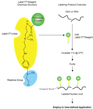 ¶Ç, Çٻ꿡 ¿Ã³¸® µîÀÇ Àü󸮰¡ ÇÊ¿äÇÏÁö ¾Ê°í, ÇÙ»ê º»·¡ÀÇ »óÅ ±×´ë·Î Label IT ½Ã¾àÀÇ ¹ÝÀÀ¼º ±×·ìÀÌ ÇÙ»ê°ú °øÀ¯ °áÇÕÇϸç, ÀÌ·¸°Ô Ç¥ÁöµÈ ÇÙ»êÀº °¢Á¾ ´Ù¾çÇÑ hybridization (¿¹, FISH, southern blotting, northern blotting µî)¿¡ ÀÌ¿ëµÉ ¼ö ÀÖ´Ù. Ç¥Áö ¹°Áú·Î´Â CX-Rhodamine, MFP488, Fluorescein, Biotin, Cy3, Cy5 Áß ¼±ÅÃÇÒ ¼ö ÀÖ´Ù.