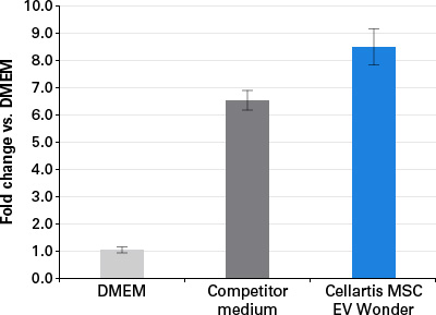MSCs were cultured in Cellartis MSC Xeno-Free Culture Medium, followed by EV production with Cellartis MSC EV Wonder for five days. A ninefold increase in particle concentration was observed with MSC EV Wonder as compared to DMEM.