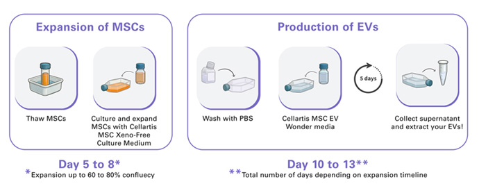 Cellartis¢ç MSC Xeno-Free Culture Medium (Code Y50200)À» ÀÌ¿ëÇÑ MSC expansion°ú Cellartis¢ç MSC EV Wonder¢â (Code Y51000, º» Á¦Ç°)À» ÀÌ¿ëÇÑ EV »ý»êÀ̶ó´Â °£´ÜÇÑ 2´Ü°è °úÁ¤À» ÅëÇØ ÆíÂ÷¸¦ ÃÖ¼ÒÈ­ÇÑ EV »ý»ê ½ÇÇö °¡´É