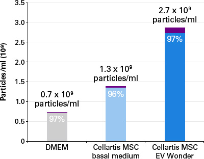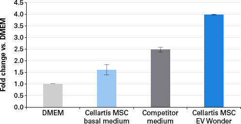 Improved EV production over competitor medium as measured by NanoFCM. MSCs were cultured in Cellartis MSC Xeno-Free Culture Medium, followed by EV production with Cellartis MSC EV Wonder for five days. A ninefold increase in particle concentration was observed with MSC EV Wonder as compared to DMEM.