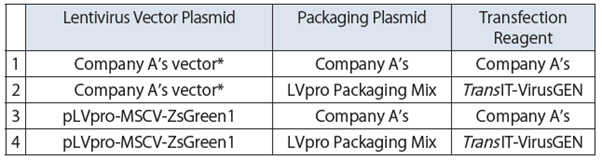 pLVpro vector plasmid·ÎºÎÅÍ Àü»çµÈ ÀçÁ¶ÇÕ ¹ÙÀÌ·¯½º RNA´Â ¿ÏÀüÇÑ viral particle·Î ¸¸µé¾îÁö¸ç (Figure 1), ¹ÙÀÌ·¯½º Á¦ÀÛÀ» À§ÇÑ transfection ½Ã¿¡´Â º¸´Ù ³ôÀº ¿ª°¡ÀÇ ¹ÙÀÌ·¯½º¸¦ »ý»êÇϵµ·Ï ±¸ÃàµÈ Lenti-X¢â 293T Cell Line (Code 632180)°ú functionalÇÑ ¹ÙÀÌ·¯½º »ý»ê È¿À²À» ³ô¿©ÁÖ´Â TransIT¢ç-VirusGEN¢â Transfection Reagent (Code MIR 6700)À» ÃßõÇÑ´Ù.