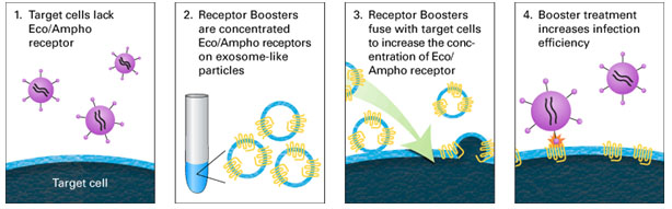 ±×¸². Receptor Boosters are concentrated exosome-like vesicles that are applied to your target cells prior to infection with virus. Boosters result in increased transduction efficiency because treatment increases the cell surface density of the receptor recognized by the lentivirus (ecotropic) or retrovirus (ecotropic or amphotropic). Using this technology, for example, you can coat human cells with the ecotropic receptor (which is otherwise absent), enabling them to be transduced with ecotropic retrovirus or ecotropic lentivirus.