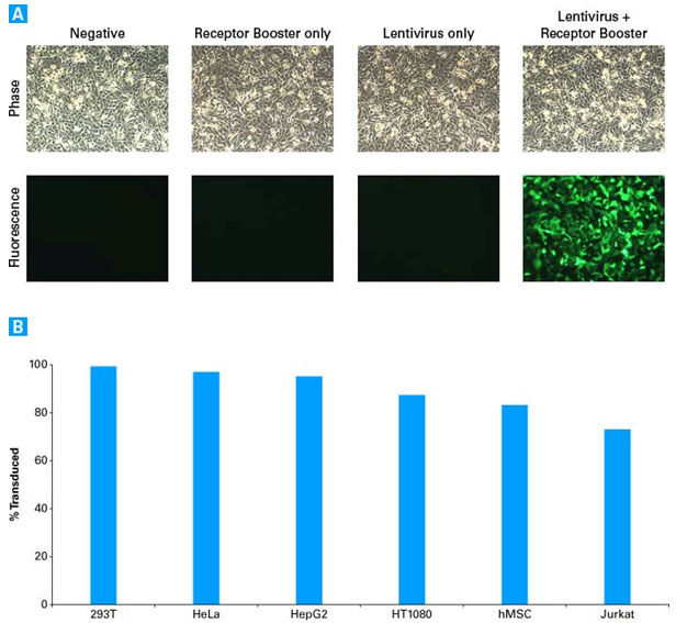 ±×¸². Transduction of human cells with ecotropic lentivirus can result in high infection efficiency, regardless of the cell line used. Panel A. HT1080 cells were plated in 6-well plates 24 hr prior to transduction and incubated with 10 ¥ìl Ecotropic Receptor Booster for 2 hr. Cells were then transduced with Lenti-X ZsGreen1 lentivirus (MOI=~15) produced using Clontech's Lenti-X HTX Ecotropic Packaging System and assayed 48 hr later for ZsGreen1 expression. Panel B. A variety of human cell types that are normally resistant to transduction by ecotropic-pseudotyped lentiviral vectors were rendered susceptible to transduction by pre-treatment with the Ecotropic Receptor Booster