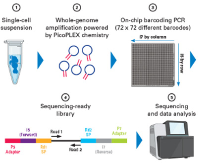 ¨çShasta¢â Single Cell SystemÀ¸·Î 5,184 nanowell chip¿¡ single cell ºÐÁÖÇÔ. À̹Ì¡ ¼ÒÇÁÆ®¿þ¾î¸¦ ÀÌ¿ëÇÏ¿© single cellÀÌ Æ÷ÇÔµÈ wellÀ» ¼±ÅÃÇϰí, ¨èShasta¢â Single Cell SystemÀº preamplification °ú amplification steps¿¡ ÇÊ¿äÇÑ ½Ã¾àÀ» ºÐÁÖÇϰí, ¨é72°³ÀÇ i5 ¹× 72°³ÀÇ i7 primer¸¦ ºÐÁÖÇÏ¿© on-chip barcoding PCRÀ» ÇÑ´Ù. ¨êoff-chip purificationÈÄ¿¡ pooled & barcoded libraries´Â Illumina¢ç sequencingÀÌ °¡´ÉÇÏ´Ù. ¸¶Áö¸·À¸·Î ¨ësequencing°ú data analysis¸¦ ¼öÇàÇÑ´Ù.