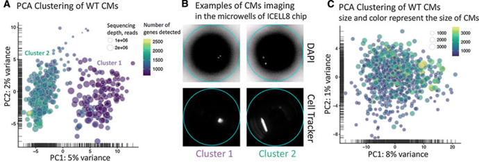 scRNA-seq µ¥ÀÌÅÍÀÇ ¿¹ºñ ÁÖ¼ººÐ ºÐ¼®Àº ½É±Ù¼¼Æ÷°¡ µÎ °³ÀÇ ±¸ºÐµÇ´Â Ŭ·¯½ºÅ͸¦ Çü¼ºÇÏ¿´À½À» ³ªÅ¸³ÂÁö¸¸, ½Éµµ ÀÖ´Â ºÐ¼® °á°ú, Ŭ·¯½ºÅ͸µÀÌ °ËÃâµÈ À¯ÀüÀÚÀÇ Àý´ë ¼ö¿Í °ü·ÃÀÌ ÀÖ´Â °ÍÀ¸·Î ³ªÅ¸³µ´Ù (±×¸² 2, ÆÐ³Î A). ICELL8 ±â±â¿¡´Â ¼¼Æ÷ ºÐÁÖ ÈÄ À̹Ì¡ ´Ü°è°¡ ÅëÇյǾî Àֱ⠶§¹®¿¡ ÀúÀÚ´Â °¢ ¼¼Æ÷¸¦ º¸°í À̸¦ ½ÃÄö½Ì °á°ú¿Í ¿¬°ü½Ãų ¼ö ÀÖ¾ú´Ù. ÀÌ·¯ÇÑ »ó¼¼ÇÑ ºÐ¼®À» ÅëÇØ Ŭ·¯½ºÅÍ 1À» Çü¼ºÇÑ ¼¼Æ÷°¡ ¸·´ë ¸ð¾çÀÇ ÇüŸ¦ ÀÒ°í ÀÛÀº Å©±â¿¡ È帴ÇÑ ¼¿ ¸ð¾çÀ¸·Î °¡´ÆÇÒ ¼ö ÀÖ´Â ¼¼Æ÷ ¼Õ»óÀ» ÀÔ¾ú°í, ÀÌ·Î ÀÎÇØ RNA ºÐÇØ°¡ ÀϾÀ½À» È®ÀÎÇÏ¿´´Ù (±×¸² 2, ÆÐ³Î A ¹× B).